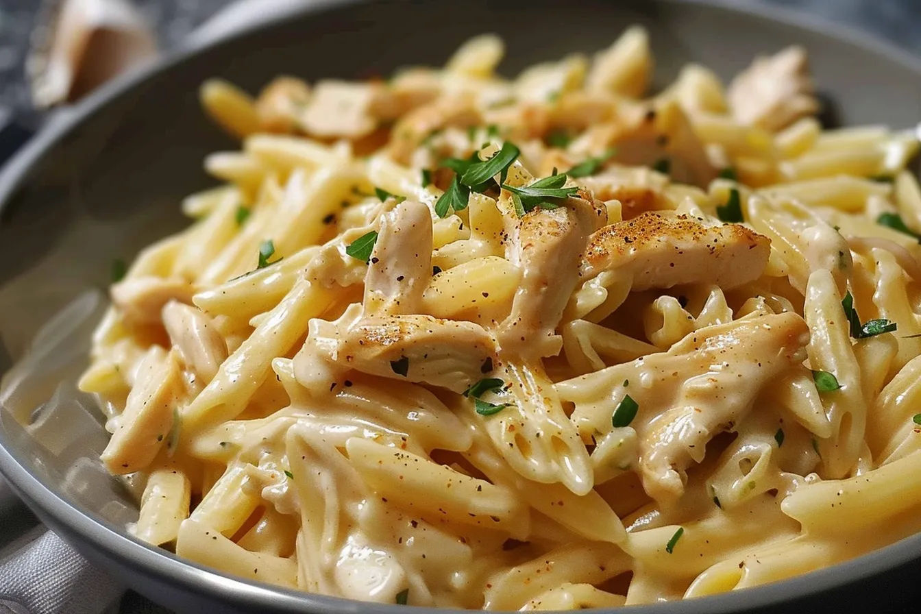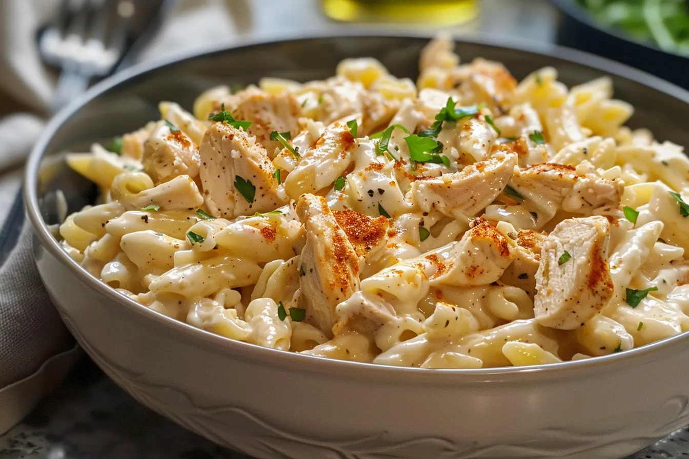 - Combine and Serve. Add the cooked chicken and drained pasta to the skillet with the cheese sauce. Toss to coat everything evenly. If the sauce is too thick, add a little of the reserved pasta water until it reaches your desired consistency. Serve immediately, garnished with fresh parsley, if desired.
