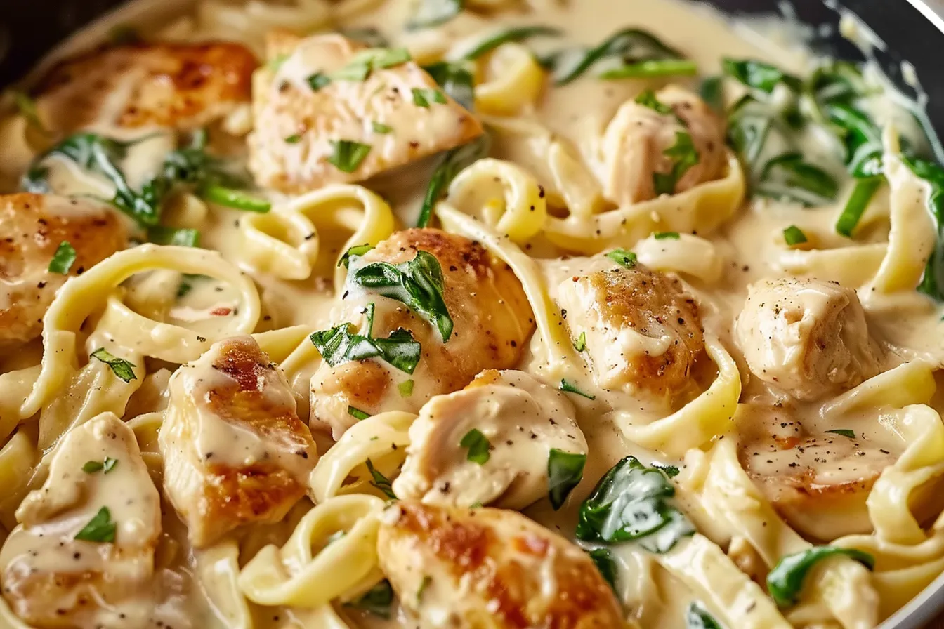 • Combine and Serve: Add the cooked pasta and chicken to the skillet with the Alfredo sauce. Toss to coat everything evenly. Garnish with chopped fresh parsley. Serve immediately.