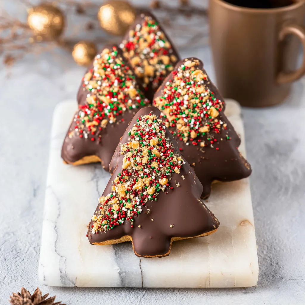 - Step 11: Dip and Decorate. Dip each Christmas tree into the melted chocolate, coating it completely. Place the dipped trees on a parchment-lined baking sheet and immediately sprinkle with Christmas sprinkles.