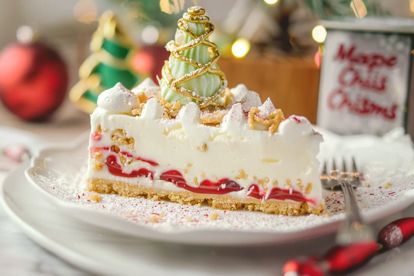 A delightful no-bake cheesecake that resembles a Christmas tree, combining creamy cheesecake and a buttery cookie crust, perfect for the holiday season.
