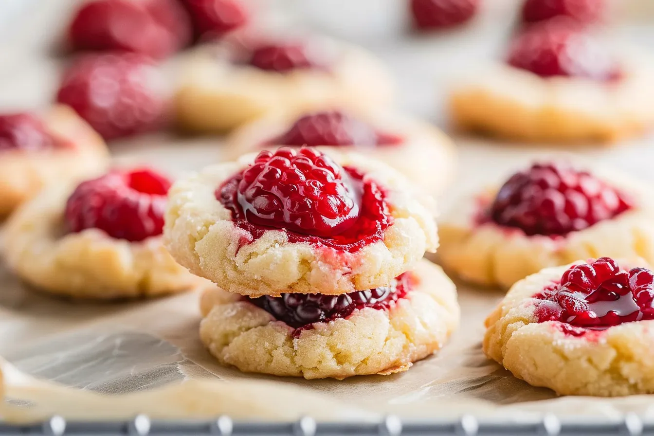 Buttery shortbread cookies with a sweet raspberry jam filling. These Raspberry Thumbprint Cookies are simple, festive, and absolutely irresistible. A perfect cookie recipe for busy families and holiday gifting.
